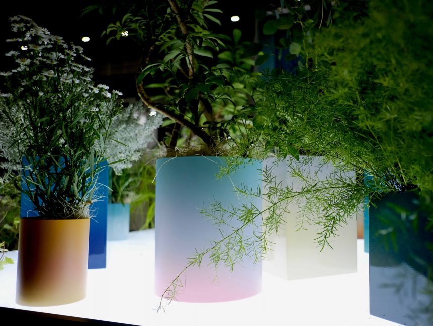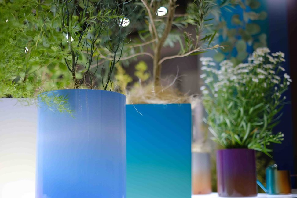 ホテル館内で使用されるステンレス花器へのグラデーション粉体塗装をご採用いただきました。