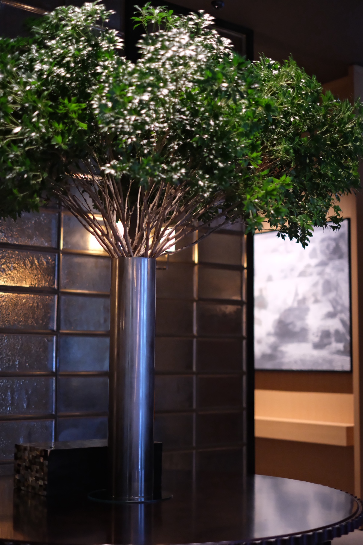 重みのある色合いで仕上げたステンレスの花器。無彩色のグラデーションが活けられた植物の色味を際立ててくれます。