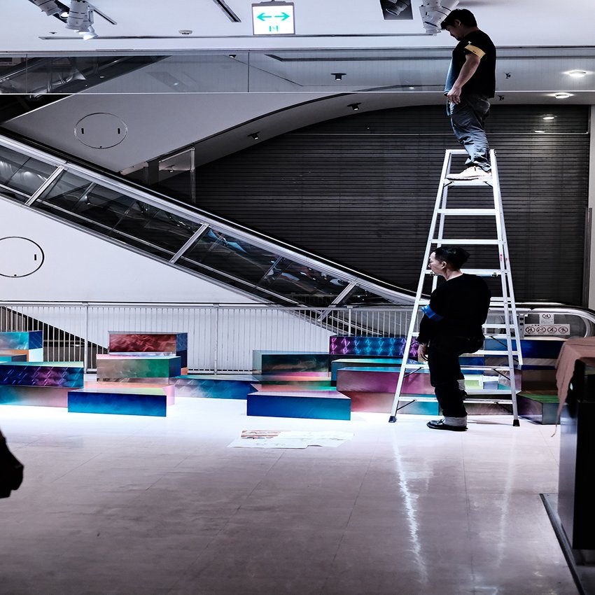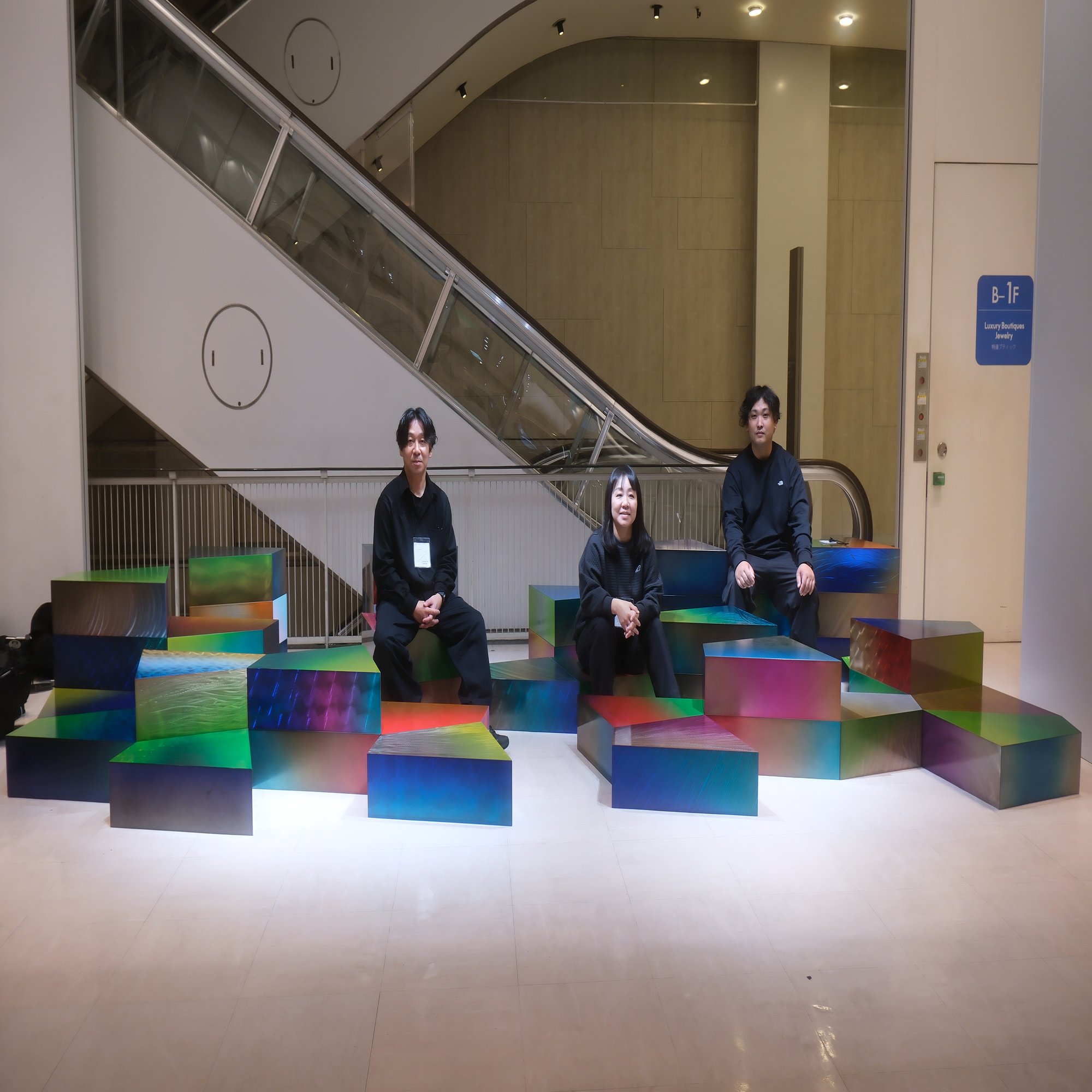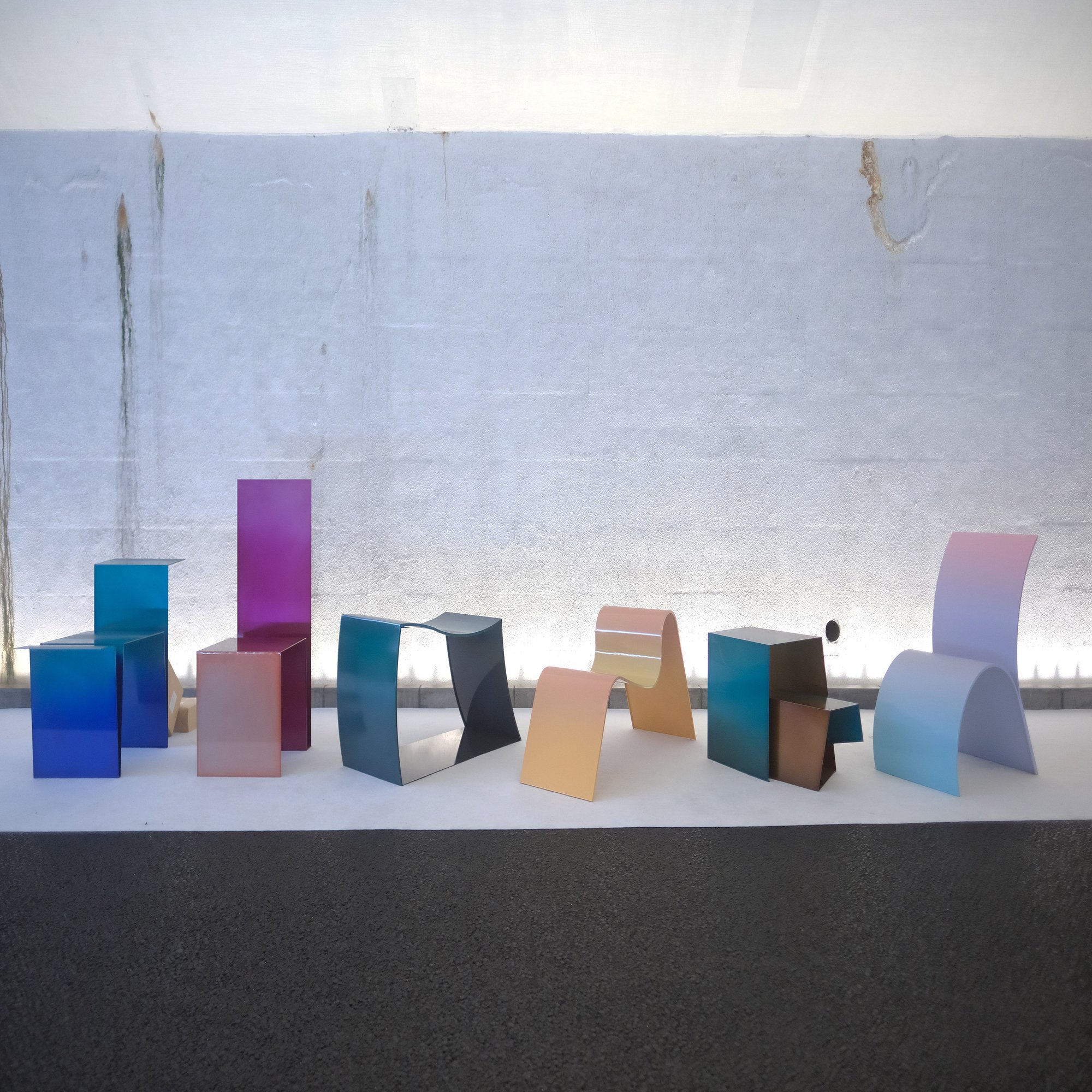 日比谷OKUROJIという高架内の通路に展示したので、DESIGNART TOKYOを見て回る人以外の多くの通行人の方々にも見てもらい、そして実際に座っていただいたことで、グラデーション粉体塗装の発色の美しさを体感していただける展示となりました。