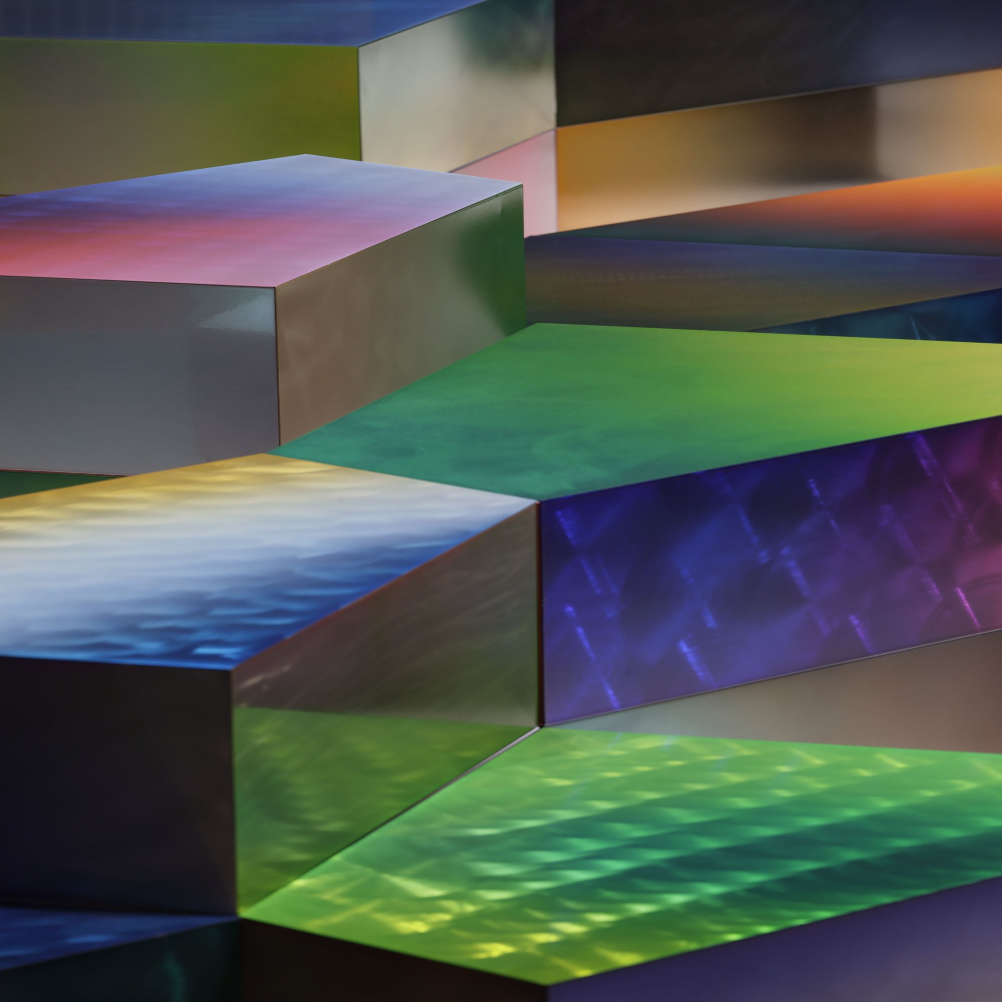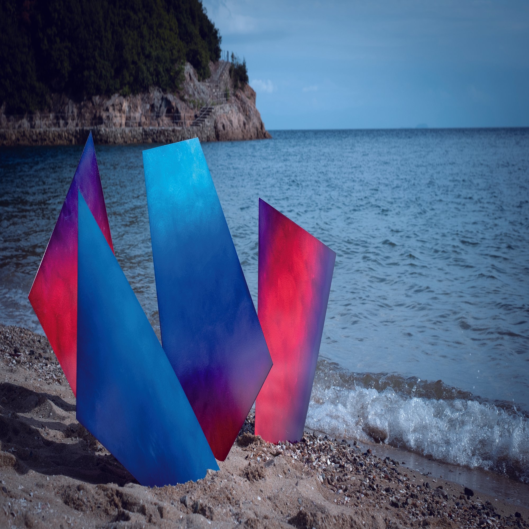 「Chromatic Symphony of Landscapes」は、グラデーション粉体塗装の塗装技術を得意とするCYUON(有限会社シリウス)と、株式会社落合守征デザインプロジェクトの協働によって、自然の景観と人の営みを響き合わせる空間と家具を創出したプロジェクトである。舞台としたのは、豊かな色彩の世界を創り出すCYUONの周囲の、瀬戸内の穏やかな海原と、仙酔島の豊かな地形に宿る自然の力。その風光明媚な水辺の景色から抽出した色彩を基調に、岩場の荒々しい質感や大地の重層的な色合いを帯びた家具群をデザインした。それらは個々が彫刻的な存在感を放ちながらも、積み重ねられることで地形の断片のように空間に風景を立ち上げていく。家具の配置は固定化されたものではなく、ランダムに積層されることで多様な場所性を生み出し、訪れる人々は自らの身体感覚に従って居場所を選び取ることができる。そこには、自然の力に呼応し、大地の隆起や水の揺らぎが空間へと翻訳された風景が立ち現れる。このプロジェクトは、単なる家具の集合にとどまらず、自然の地形や水景を思わせる多層的な体験を宿す場をつくり出す試みである。空間に散りばめられた家具の一つひとつが、自然の記憶を宿す断片となり、人々がそれぞれの時間を重ねることで、新たな風景が生み出されていく。