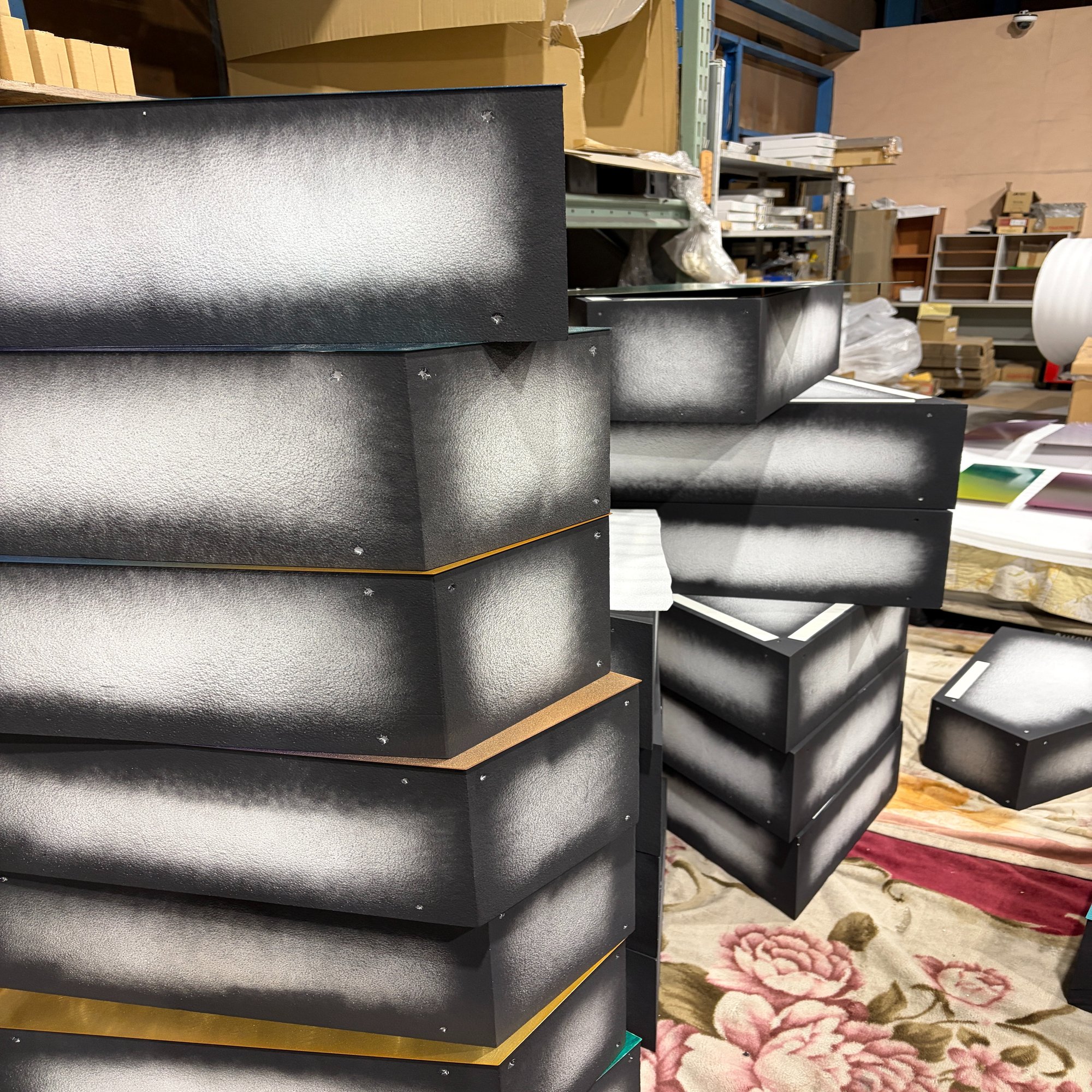実は今回は新たな試みも行いました。まずは製作方法について。これまではパネルの内部は金属製のフレームを製作し、そのフレームにグラデーション粉体塗装された金属プレートを取付けていたのですが、今回は重量を軽くしたい(50個もあるので)、そして製作コストも抑えたいということで初めての試みなのですが内部を発泡スチロールで製作し、その発泡スチロールにパネルを接着するという方法で製作しました。今まで発泡スチロールを手配したことが無かったのですが、地元の知り合いの資材会社が頑張ってくれて無事に加工が出来、しっかりと貼付けも出来、無事に軽くてコストも抑えることに成功しました。この製造方法はこれからの案件で活かせていけると思っていますので、またどこかのタイミングで使ってみたいと思っています。